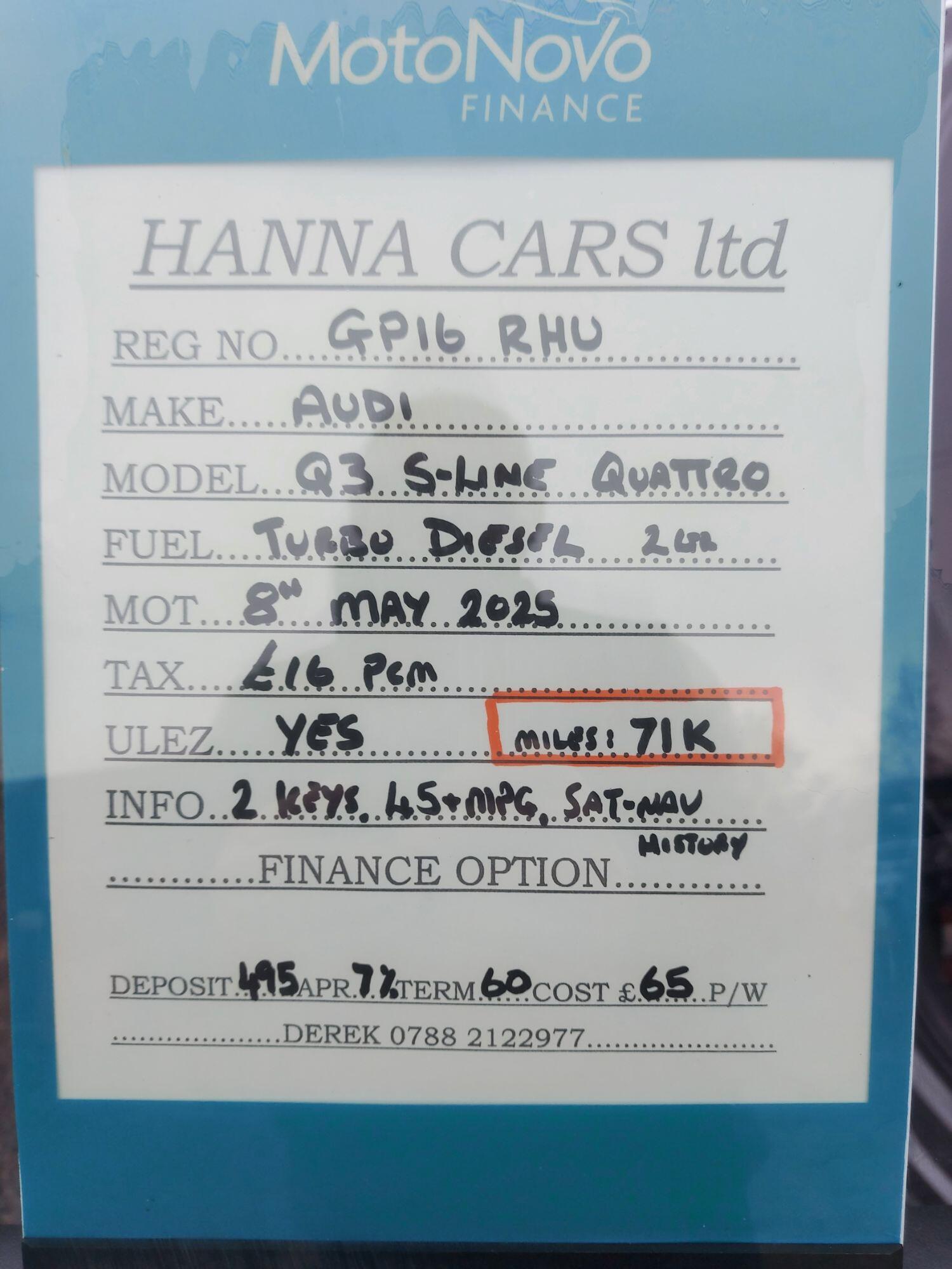 Hanna Cars ltd are a credit broker and not a lender. We are Authorised and Regulated by the Financial Conduct Authority. FCA No: 844790 Finance is Subject to status. Other offers may be available but cannot be used in conjunction with this offer. We work with a number of carefully selected credit providers who may be able to offer you finance for your purchase.
